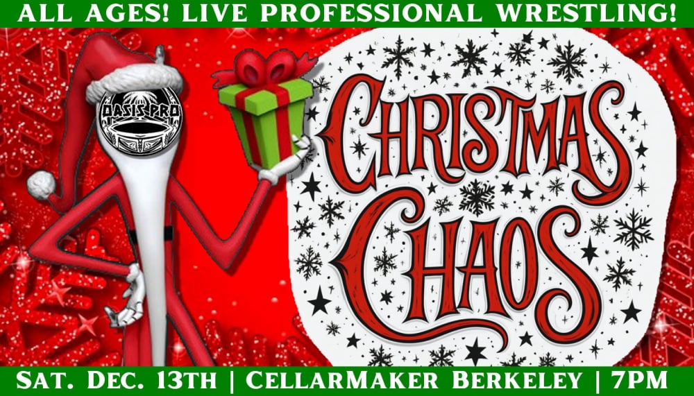 Oasis Pro: Christmas Chaos is on Saturday, December 13th, at the CellarMaker Brewing Company in Berkeley.